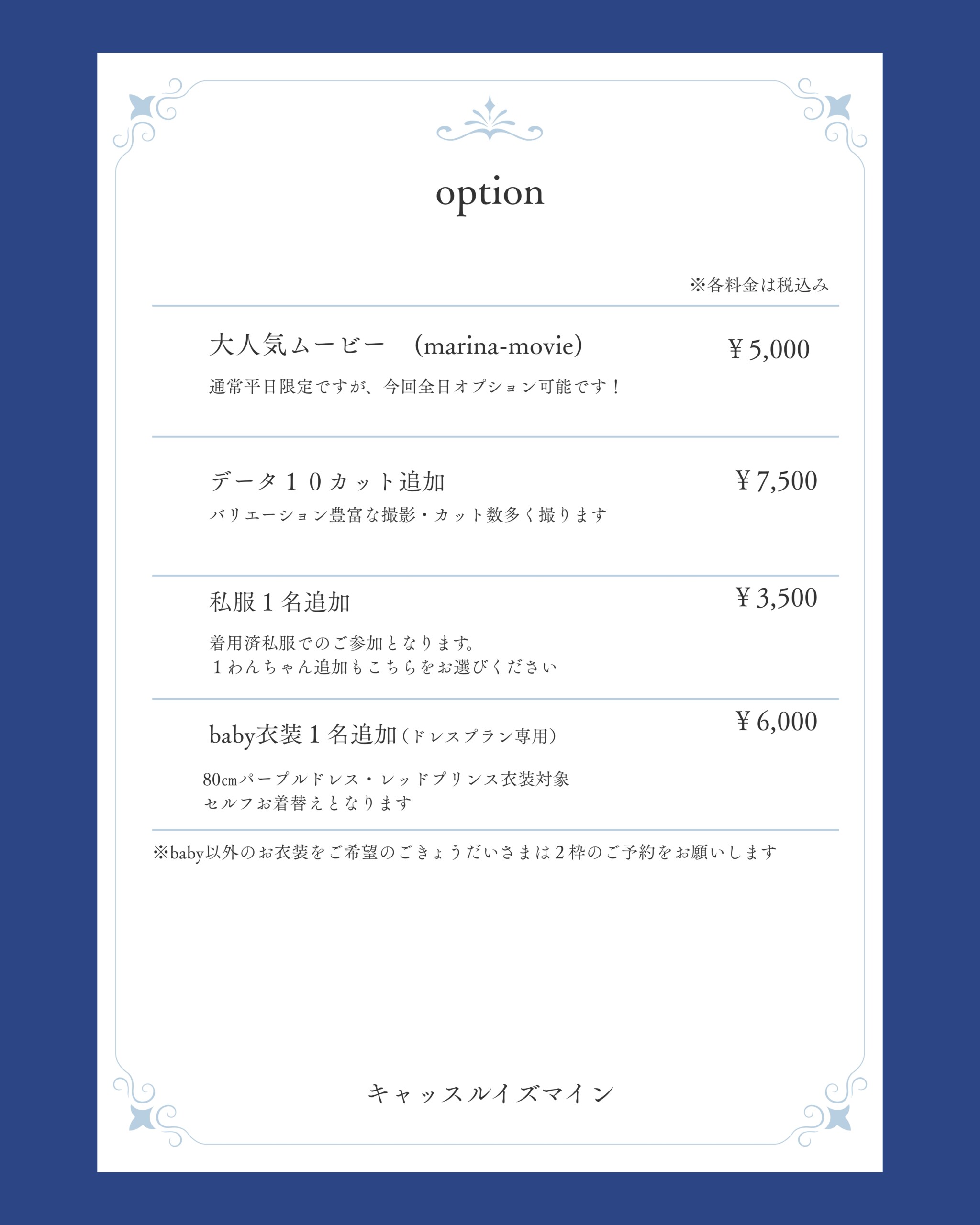 baby衣装追加オプション・私服追加オプションは基本お一人撮影なしとなります。お時間に余裕がある場合のみ撮影。