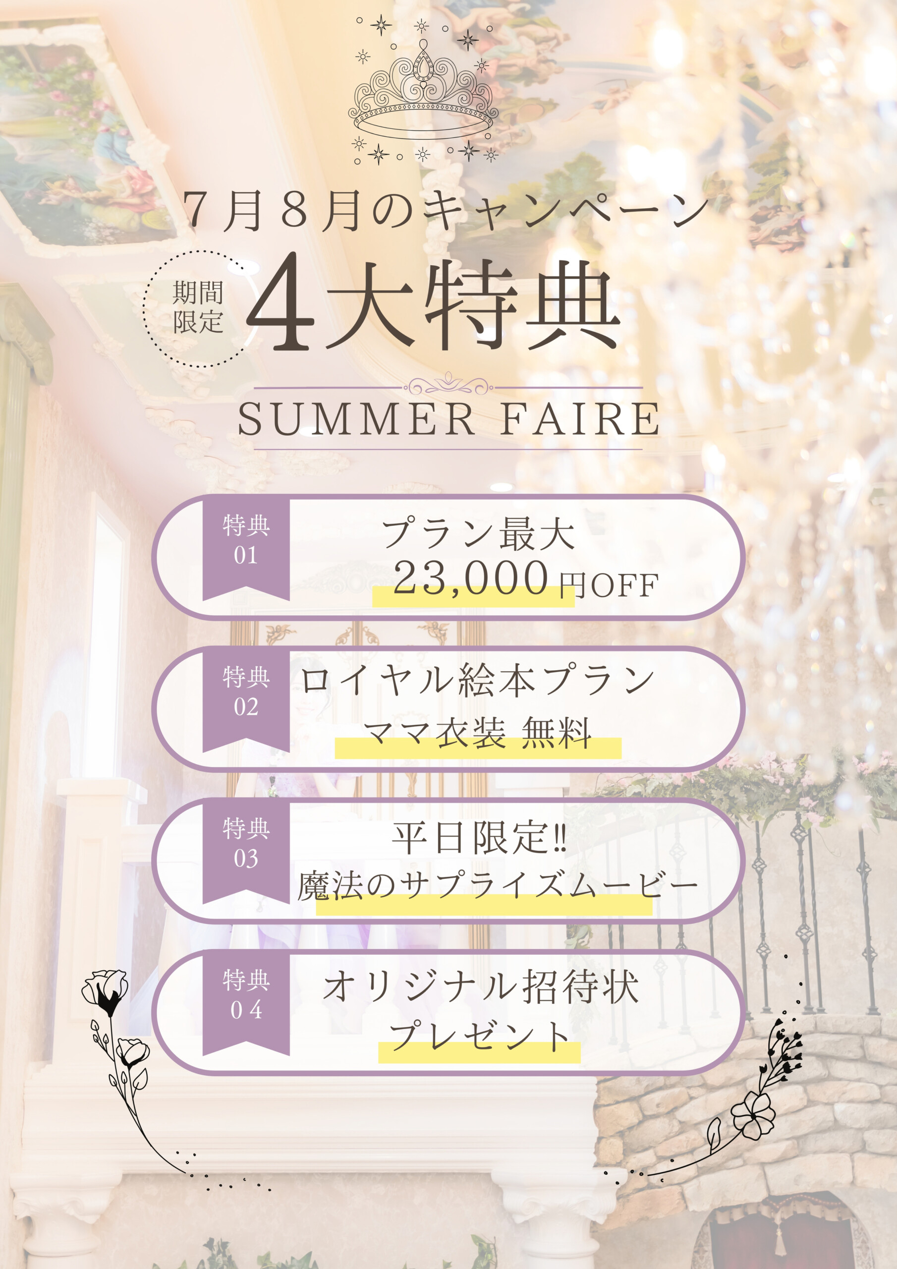 08Oct2024 現在のキャンペーン♪ Tweet Share Pin it ↑バースデーと七五三で対象 Tweet Share Pin it お城のひまわり撮影会2024 お城のクリスマスドリーム 2024.12.5〜7 最近のお知らせ一覧お知らせ一覧 🎍初夢撮影会2026💖 2026.01.03 〜ご予約状況〜 2025.12.03 秋薔薇のティーパーティー 2025.10.23 ご予約から当日の流れ 2025.08.02 お城の美術館&春の庭園撮影会 2025.04.06